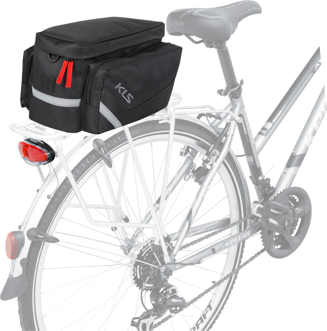 Brašna na zadný nosič KLS SPACE 12 je vyrobená z odolného a vodevzdorného materiálu Polyester 600D. Brašna má jednu hlavnú časť a dve bočné vrecká pre rýchly prístup. KLS SPACE 12 má objem 12 litrov a jej súčasťou je odnímateľný ramenný popruh,
