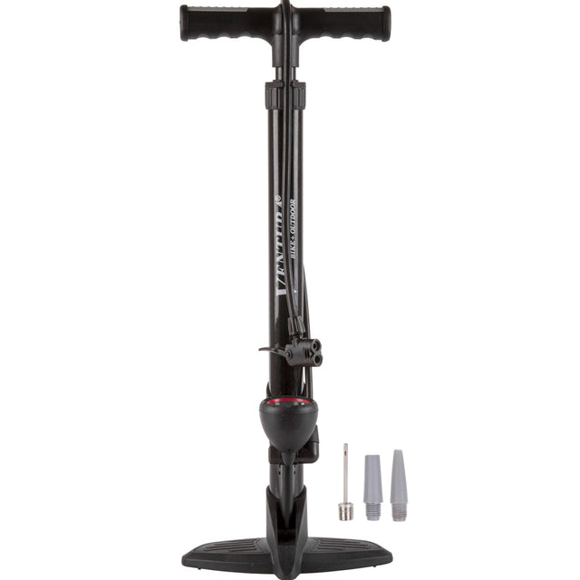 značka VENTURA, oceľ, s manometrom, 12 bar / 180 psi. s adapérom na nafukovačky a ihlou na lopty ( integrované v rukoväti pumpy ), pre všetky typy ventilov, výška 51 cm , váha 700 g